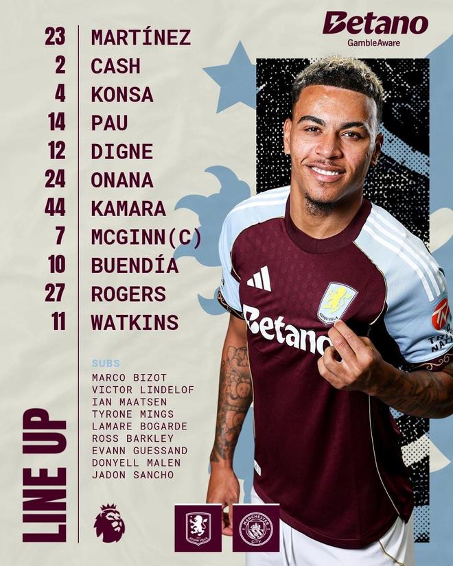 阿斯顿维拉首发:23-达米安-马丁内斯、2-卡什、4-孔萨、14-保-托雷斯、12-迪涅、24-阿马杜-奥纳纳、44-布巴卡尔-卡马拉、7-麦金、10-布恩迪亚、27-摩根-罗杰斯、11-沃特金斯