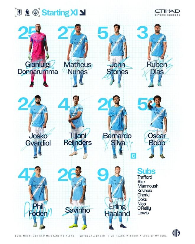 曼城客战维拉:哈兰德、福登、鲍勃、斯通斯首发,桑乔替补